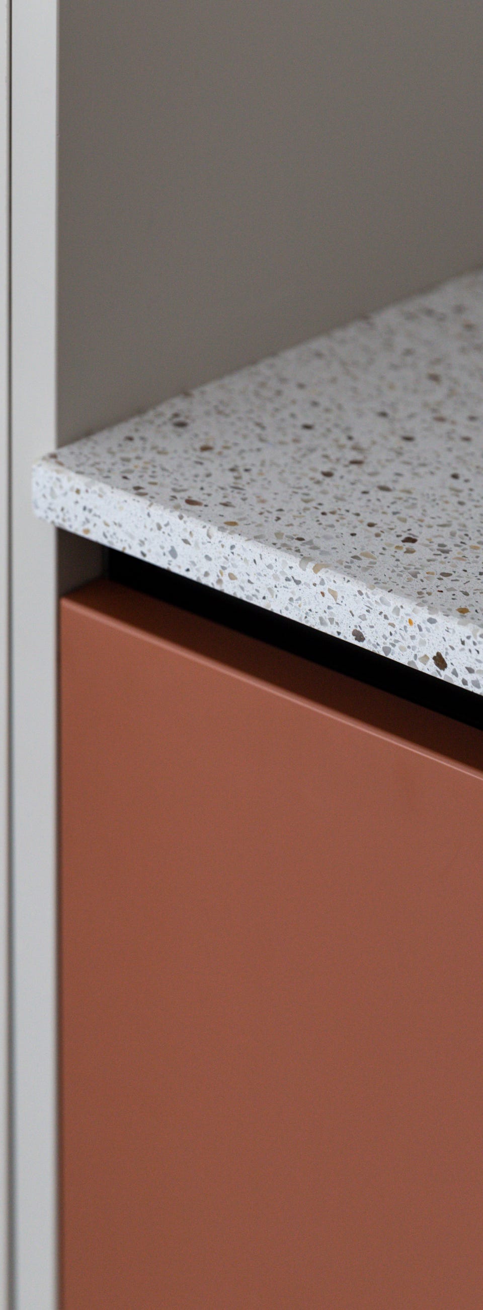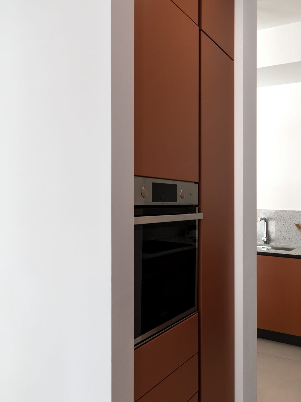 La cucina è il fulcro della casa, e qui il minimalismo si fonde con un tocco di audacia. Il colore rosso della cucina aggiunge un elemento sorprendente e dinamico, creando un punto focale vivace e accattivante. Gli armadietti in bianco e grigio si integrano armoniosamente, bilanciando l'energia del rosso con un'eleganza senza tempo.