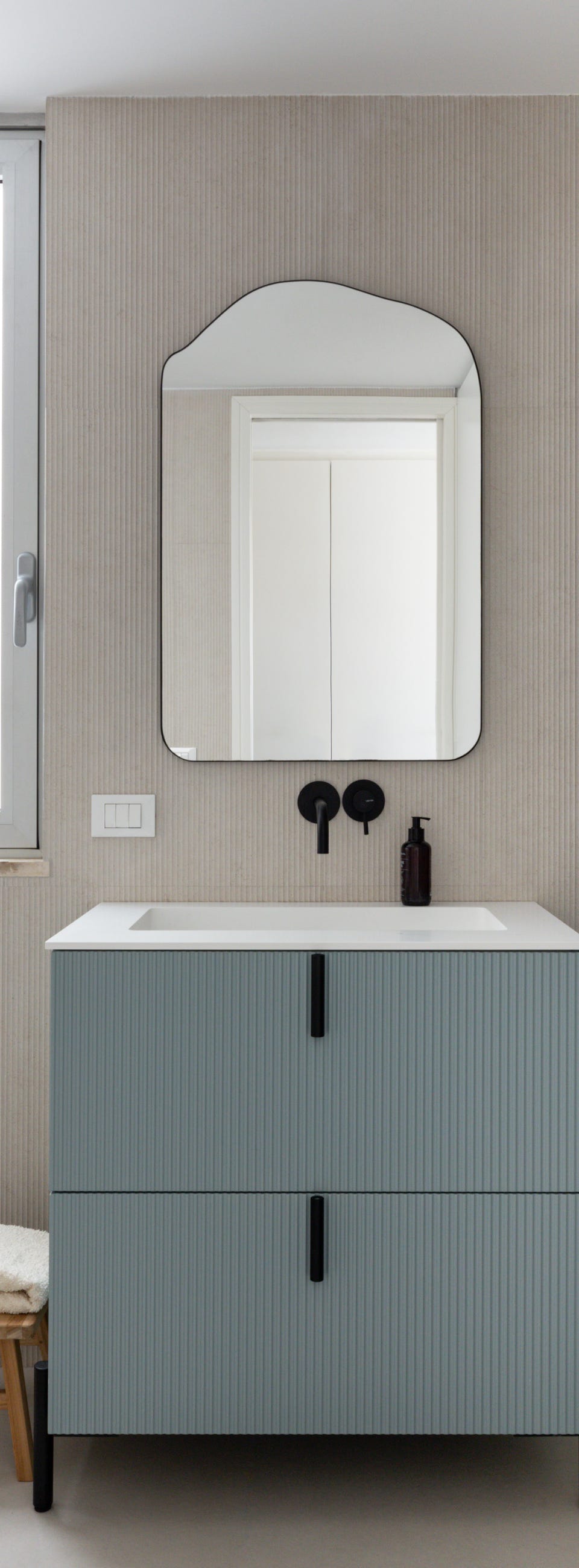 Il bagno segue lo stesso tema minimalista con finiture pulite e un design senza fronzoli.